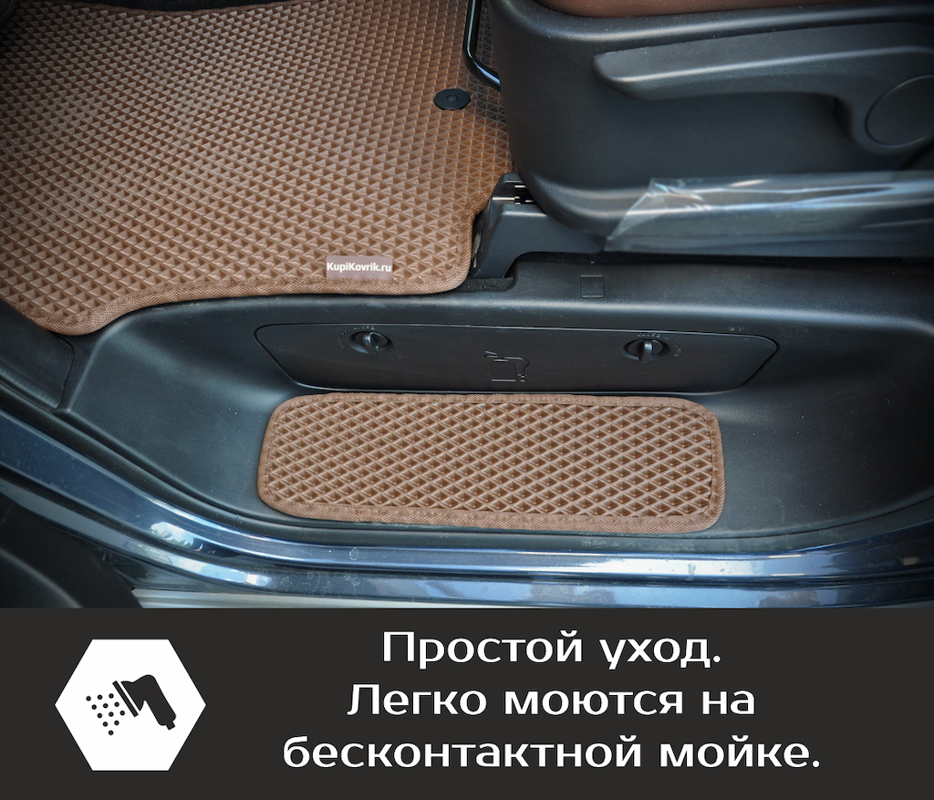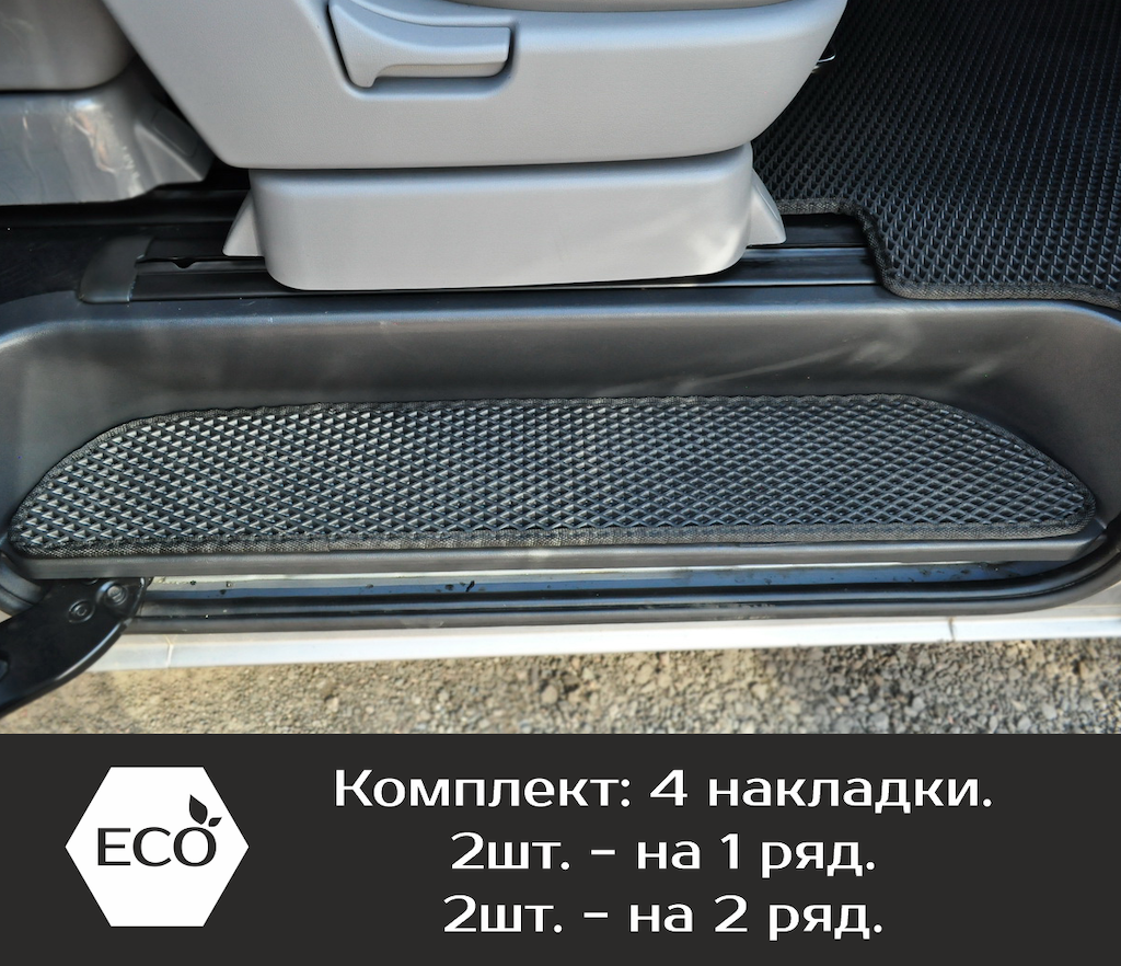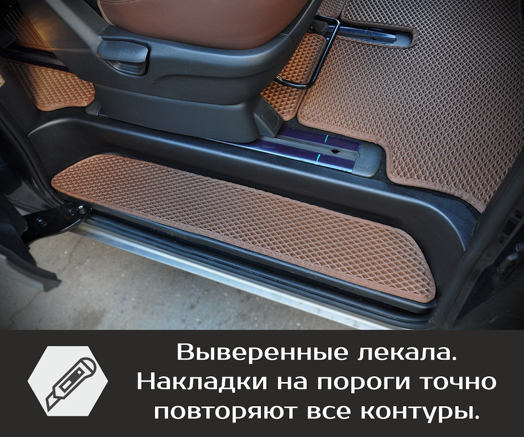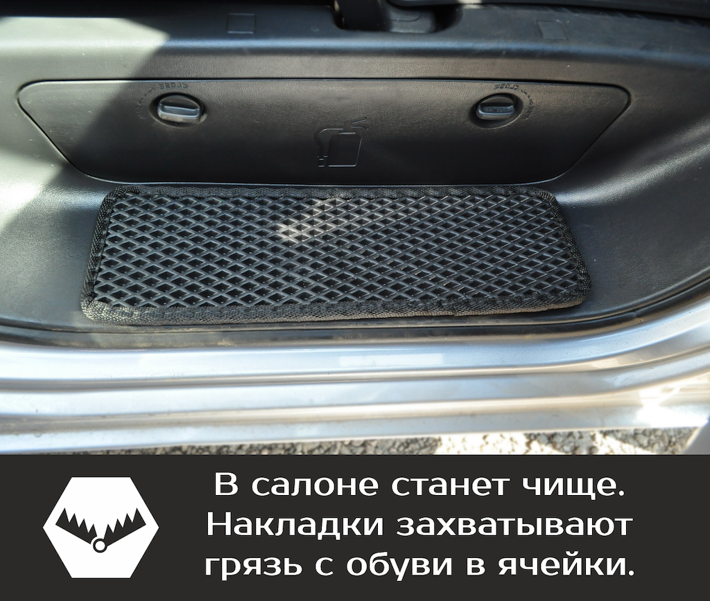 Накладки на пороги гармонично сочетаются с салонными ковриками EVA, дополняя друг друга.
