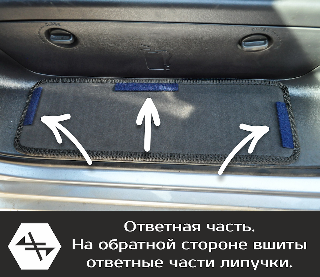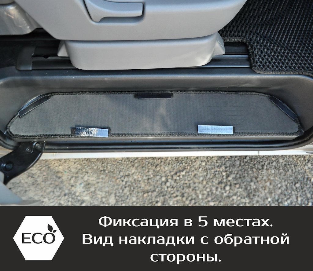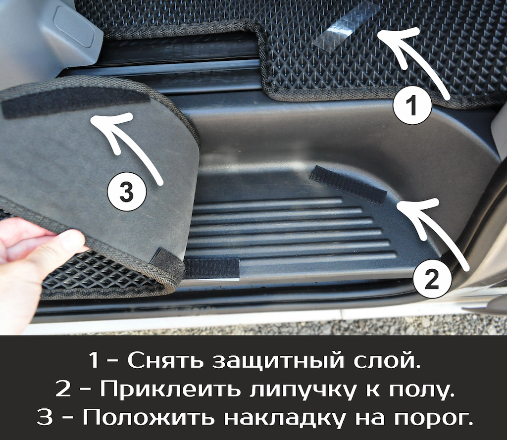 Накладки на пороги надёжно крепятся на липучку. Одна часть липучки вшита под кант на обратной стороне накладки, а вторая ответная часть - на самоклеящейся основе крепится к пластику. Накладки легко снимаются и устанавливаются обратно на своё место, повторяя форму пластика.