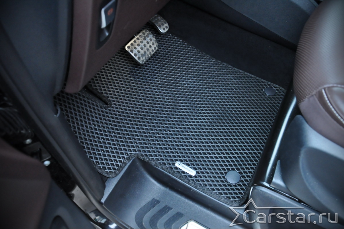 Текстильные коврики надёжно крепятся с помощью оригинальных систем фиксации. Обратная сторона имеет противоскользящее покрытие, что обеспечивает защиту от смещений и безопасность. Максимальное удобство достигается точными лекалами.